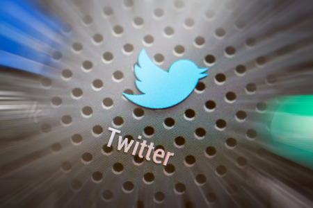 BELCHATOW, POLAND - APRIL 10, 2014 Closeup photo of Twitter icon on mobile phone screen Popular social network