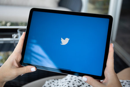 Alanya, Turkey - October 5, 2023: Woman hand holding iPad Air on the table with social networking service Twitter on the screen.