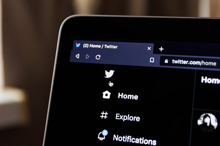 New York, USA - 9 April 2020: Twitter website on laptop screen close up. Man using service on display, blurry background, Illustrative Editorial.
