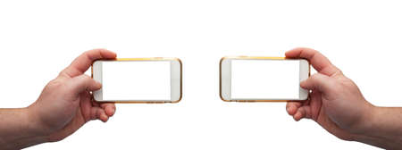 Two hands holding mobile phones on white background with empty screens for montage Close-up