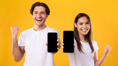 Couple showing two empty smartphone screens gesturing yes