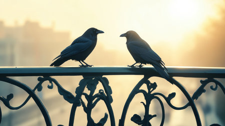Two intelligent crows face each other on an ornate railing, shrouded in early morning mist, depicting a mysterious moment in an urban setting.