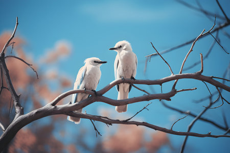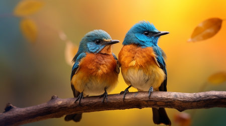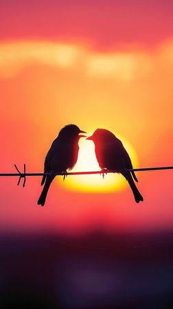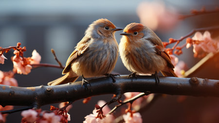 This enchanting image captures a romantic moment between two birds perched on a branch, bathed in soft morning light, showcasing nature's beauty and connection.
