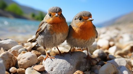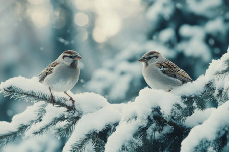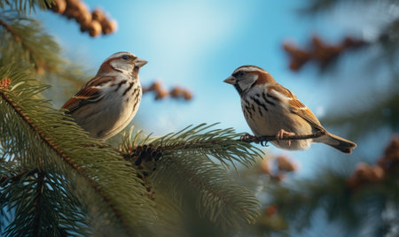 This photograph captures a couple of tiny birds perched on a tree branch. The soft, blurred background creates a dreamy effect, emphasizing the delicate beauty of the birds, Ai Gennerated