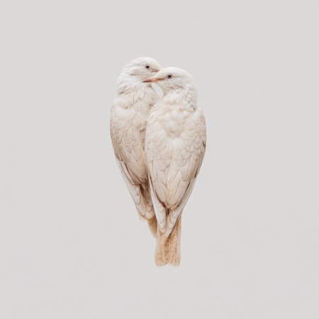 Two beautiful light-colored birds stand close together, showcasing their delicate feathers against a soft background, exuding tranquility and companionship.