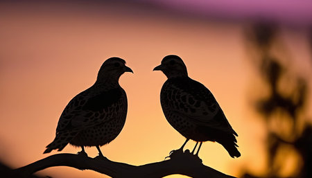 two birds sitting on a branch in front of a sunset sky with a pink and purple sky in the background and a silhouette of a plant in the foreground. . generative ai