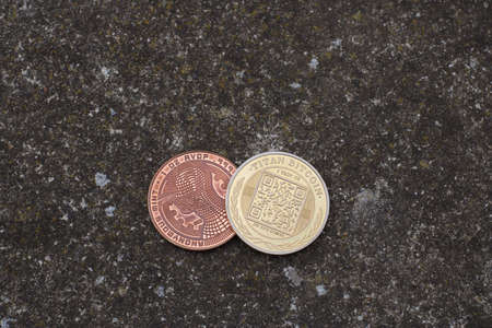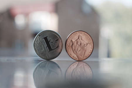 Digital currency physical silver litecoin and brass dogecoin money near the window.