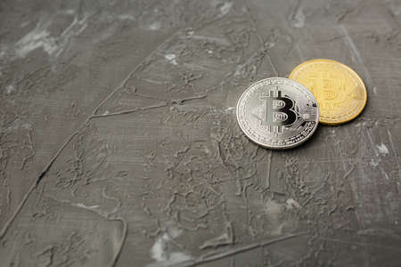 bitcoin on a gray background, coin bitcoin on the table, a lot of free space
