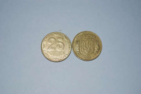 Ukrainian coins in denominations of 25 and 50 lie on an old iron vice. The concept of a crisis in the country