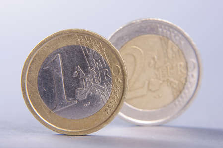 Standing coins one euro and two euro isolated on the gray background