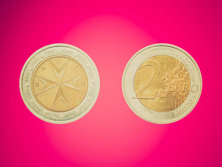 Vintage looking Two Euro coin from the Republic of Malta, Europe over red background