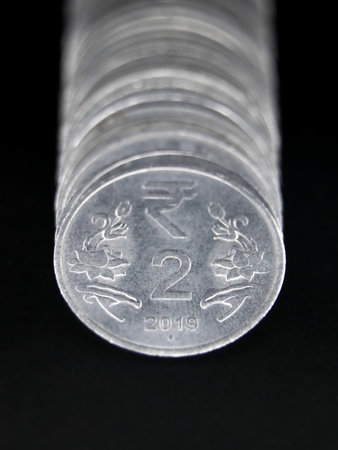 shiny 2 or two rupee silver coins of india arranged in a straight stacked row isolated in a black background in closeup macro
