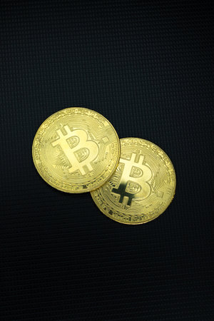 Gold bitcoin cryptocurrency coins on split gold yellow and black backgound