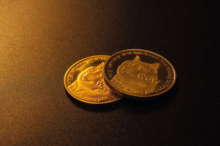 Two dogecoins over dark background