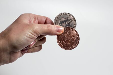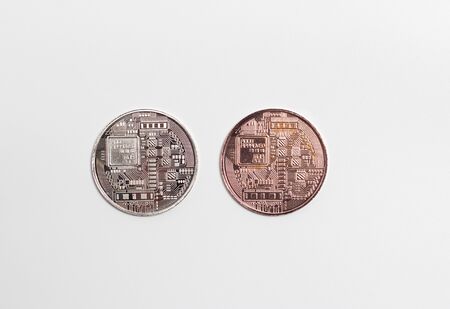 Bronze and silver bitcoin on a white background