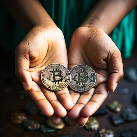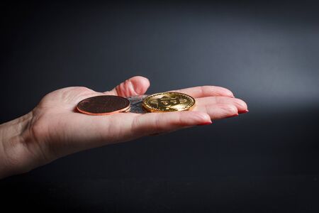 Bitcoins in a girl's hand on a black background
