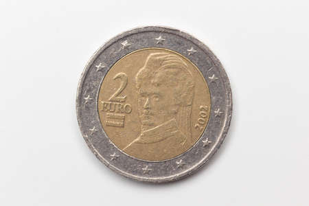 Official coin of two euros of the European Economic Community. Legal tender metal coin with different images depending on the country that issues the coin.