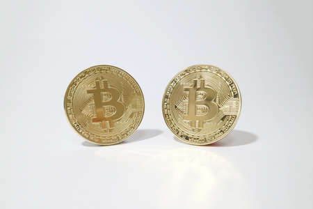 Digital currency physical bitcoin coin. Gold background coins concept.