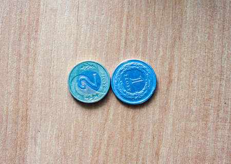 Two stacks of coins on a wooden table. Money on the table. iron denbgi lie in a stack. Coins side macro shooting.