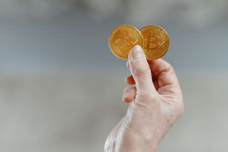Man hand holding some bitcoin in different variations. Bitcoin is the most valuable currency on the earth for now.