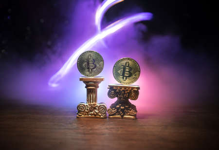 Golden Bitcoin on dark backround. New virtual money. Crypto currency. Creative artwork decoration. Selective focus