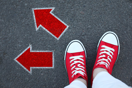 top view of feet and different direction arrows on asphalt road