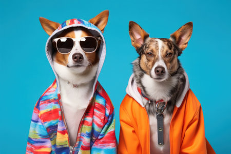 Two Trendy dogs dressed in colorful streetwear, ready for a hip outing, blue background .