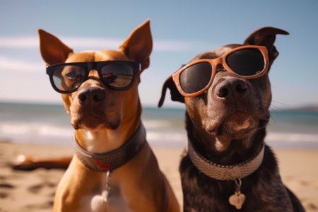 Two dogs with sunglasses on the beach at sunset, close-up