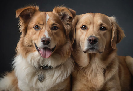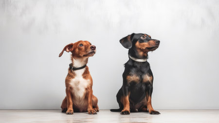 Two adorable dogs are sitting together, posing for a portrait in a professional studio setting