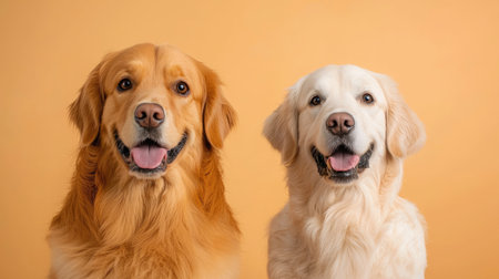 Bernese mountain dog and golden retriever panting on yellow background