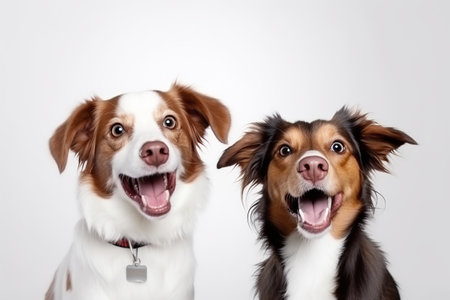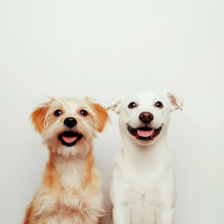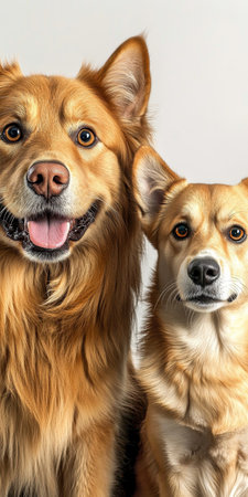 Two Adorable Dogs Posing Together on a White Background, One Smiling and the Other Curiously Alert