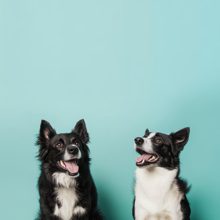 Two playful dogs with black and white fur sit side by side looking cheerful and engaged against a bright blue background.