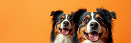 Close-up view of two Australian Shepherds, smiling broadly