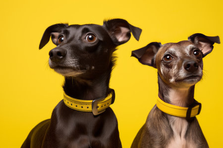 Dogs Enjoy Treat Against Vibrant Yellow Background. Concept Autumn Foliage Portraits, Candid Couples Photography, Adventure Sports Action Shots, Stunning Sunset Silhouettes.