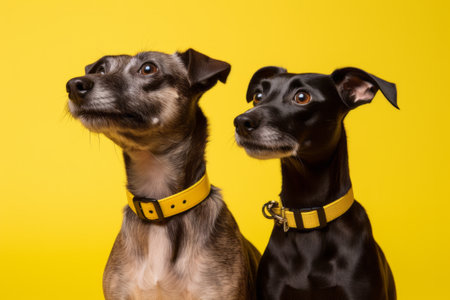 Two mutt dogs on yellow background.
