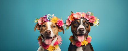 The two adorable dogs sit side-by-side isolated on a blue background. AI-generated.