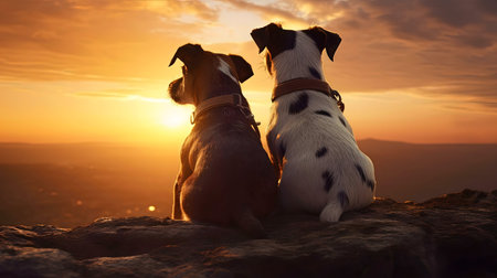 Two adorable dogs sitting on a mountain, watching a stunning sunset. Golden hour view.