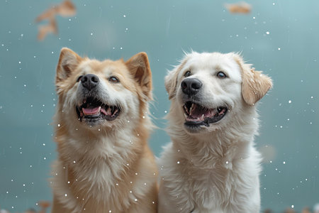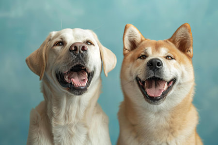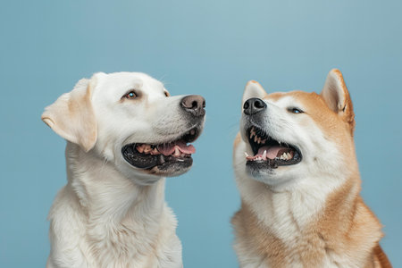 Photo of a white labrador and an akita dog laughing together on light blue background, banner with copy space area