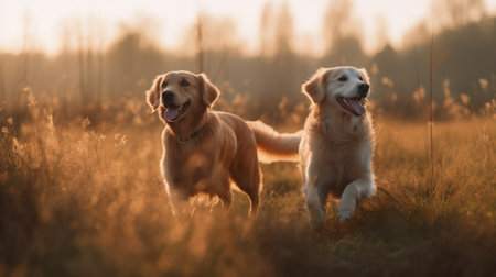 Two Golden retriever dogs frolicking in a grassy field during day sunny. Generative AI AIG18.