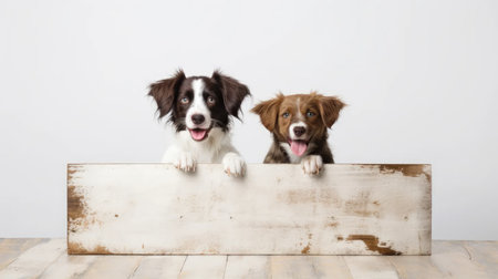 Two delightful dogs pose with an empty board against a pristine white background. Perfect for pet-related promotions,