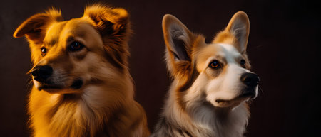 Portrait of two dogs of red and white color on a dark background