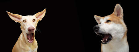 Banner two surprised and screaming dogs. Isolated on black background