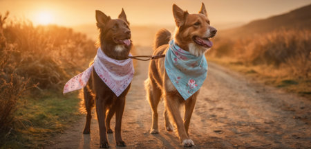 Two dogs in a bandana on a country road at sunset.