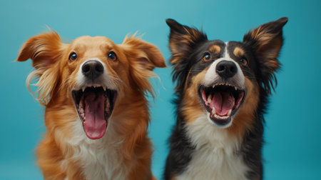 Two expressive dogs with different reactions on a vibrant blue background, one barking energetically and the other looking calm