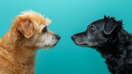 Two playful dogs interacting with each other against a vibrant turquoise blue backdrop