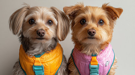 Two charming dogs with expressive faces dressed in colorful vests sit side by side.