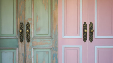 Close up of two ornate vintage double doors, one painted pastel green, the other pastel pink.