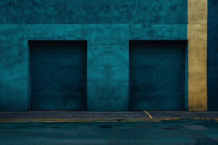 Bright teal and yellow doors create a striking contrast against a graffiti-covered wall. The urban setting reflects a blend of creativity and decay, showing the essence of street art.