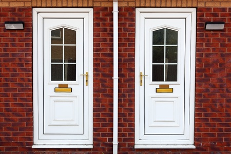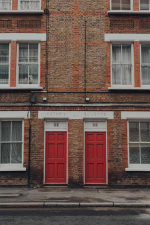 London, UK - October 17, 2021: Traditional red front doors on an apartment block in Victoria Buildings in Southwark, London. Bright coloured doors are a popular feature of home in the capital.