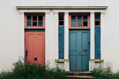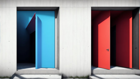 An old door stands against a vibrant wall while a new door appears near a pale wall, symbolizing life changes in a minimal style.